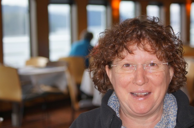 Thérèse profite de dormir encore, bercée par les vagues, je vais prendre un déjeuner costaud à la cafétéria et après avoir fait le linup (la file) je m’assied avec vue sur la mer et je regarde autour de moi… il y a que des indiens et il y a une super ambiance… ces gens sont heureux… je l’apprend par la suite ces gens sont montés tôt ce matin à Bella Bella et se rendent à Port Hardy pour faire leurs courses…