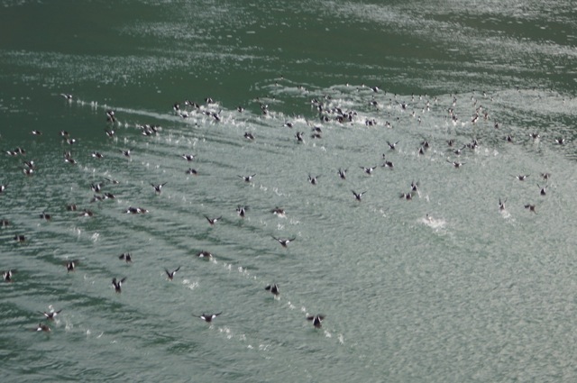 Mouettes et canards suivent la remontée de saumons , tout le monde attend son lunch et c’est la fin d’un règne réduit en pitance…