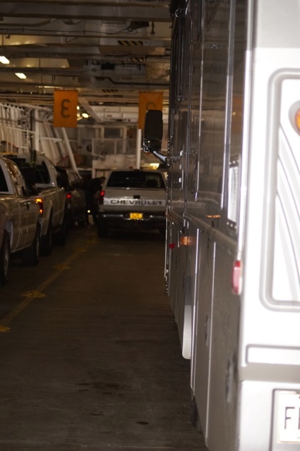 Comme on est en chargement latéral sur le bateau les marins me font rentrer en marche arrière sur la rampe pas mal en pente on est à marrée basse et quand je suis arrivé dans le ventre du monstre et ben ma place est tout au fond et c’est long cette affaire…. comment ? en marche arrière….